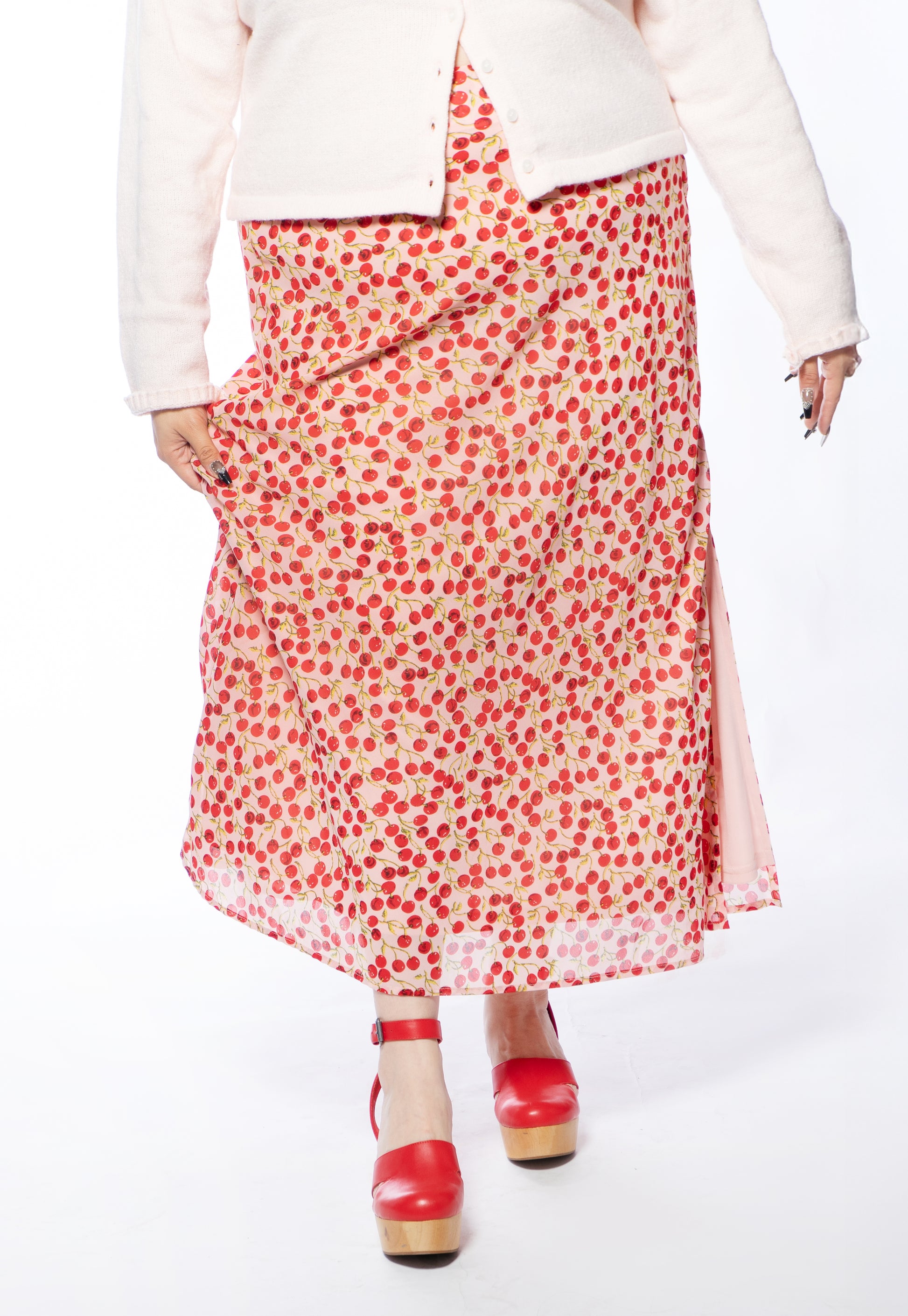 Cherry maxi plus size skirt with side slit and side zipper. Features an A-line