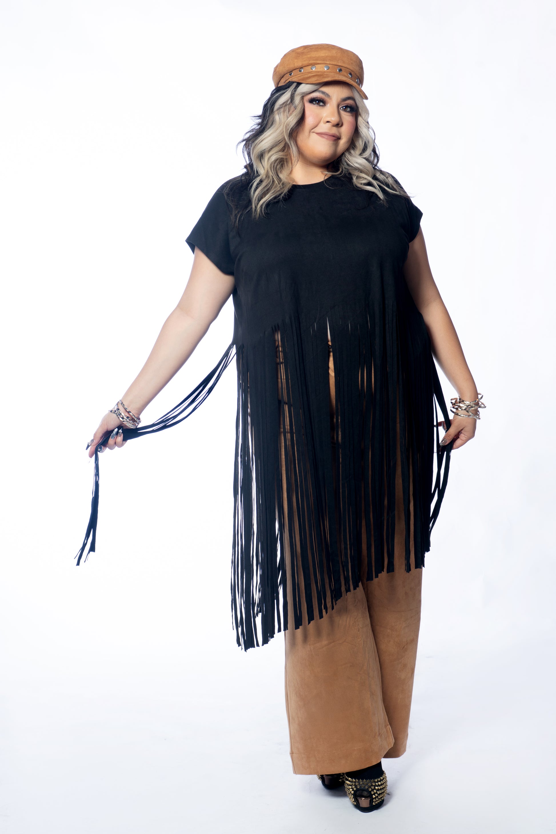 Maxi suede fringe top available in plus sizes.